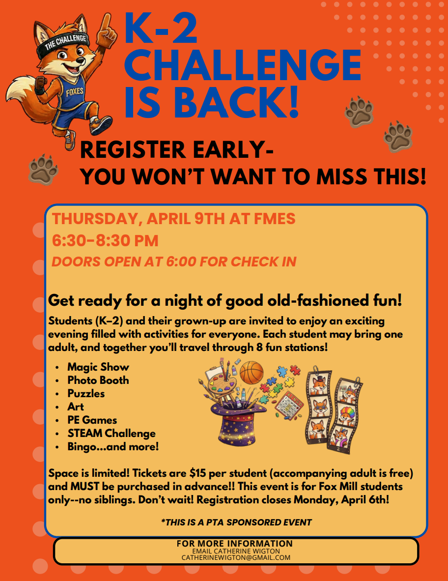 No. Due to space limitations, this event is only for Fox Mill students in Kindergarten, 1st grade, and 2nd Grade.