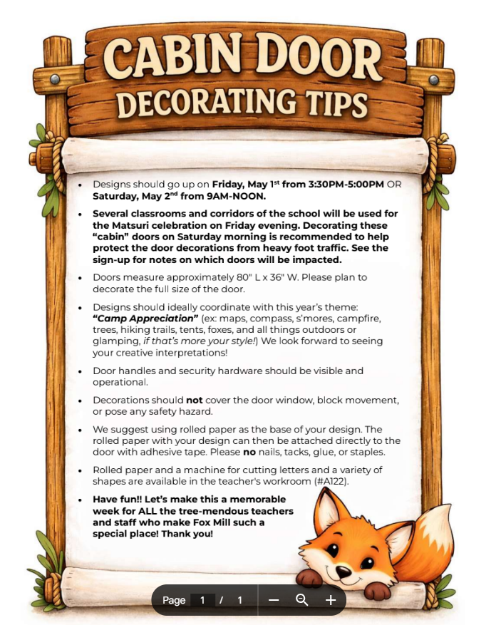 Sign up here to decorate the “cabin” door of your favorite teacher, instructional assistant, specials teacher, or support staff member—or help decorate several “cabins” all around camp!! Parents can team up and/or have their students help with the decorating!