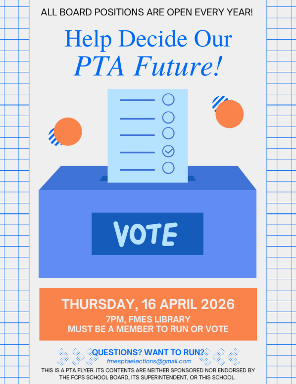 Our next PTA meeting will be held on April 16th at 7:00 PM. We encourage all families to join us, as this meeting will include PTA elections.