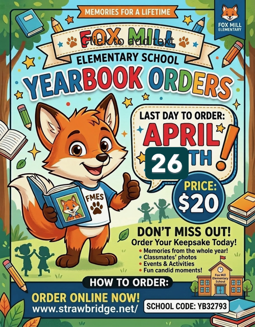 Yearbook order link HERE: https://strawbridge.fotomerchanthv.com/clients/fox-mill-elementary-school/2025-2026-yearbooks-320/access?clearSessionAuthentication=1
